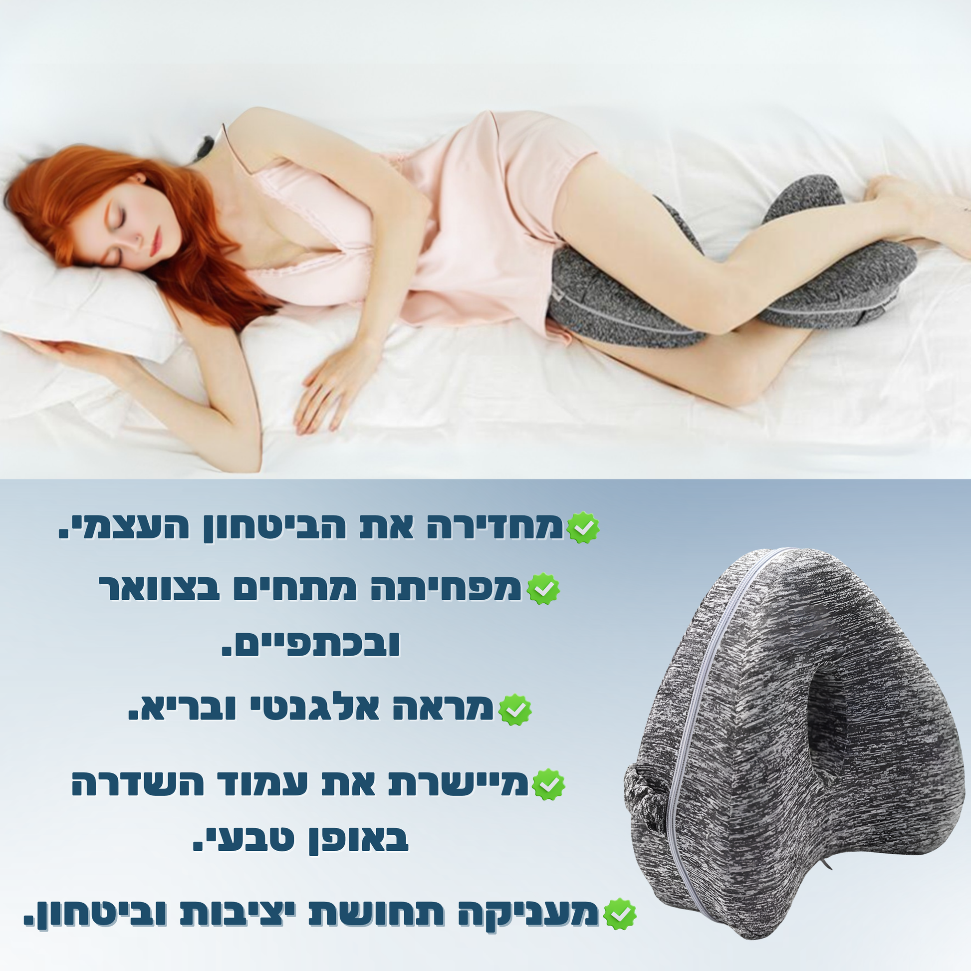 מהלקוחות מדווחים כי השימוש בכרית בין הרגליים הפחית משמעותית כאבים בגב ובברכיים לאחר שינה על הצד.